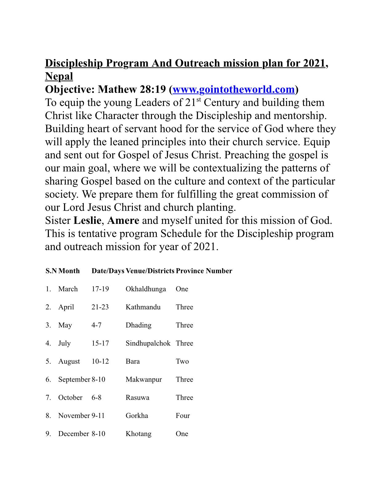 Discipleship Program and Outreach mission plan for 2021, Nepal